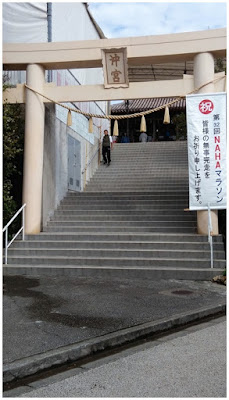 琉球八社 沖宮,看到「祝...無事完走」的漢字,就算不懂日文都能猜到一二,當然要參拜一下求順利完賽。